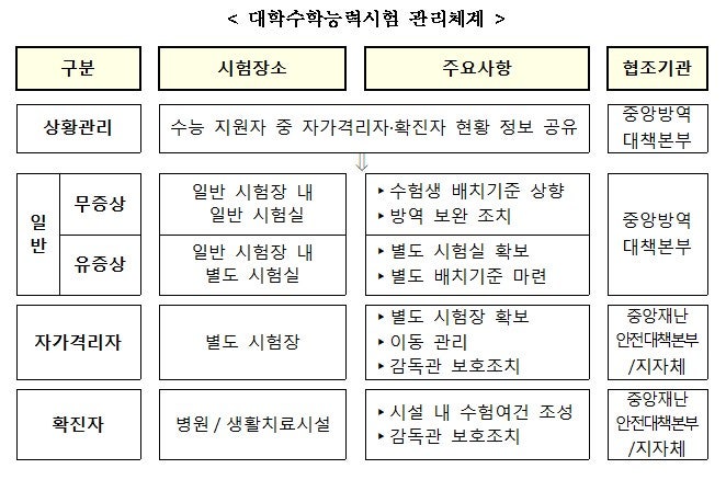 우선 수능에 응시하는 수험생을 △일반수험생 △자가격리자 △확진자로 구분해, 일반수험생은 사전에 고지된 일반시험장에서, 자가격리자는 일반시험장과 분리된 별도 시험장에서 응시하도록 했다. 확진 판정을 받은 수험생도 격리 중인 병원이나 생활치료시설에서 수능에 응시할 수 있다.