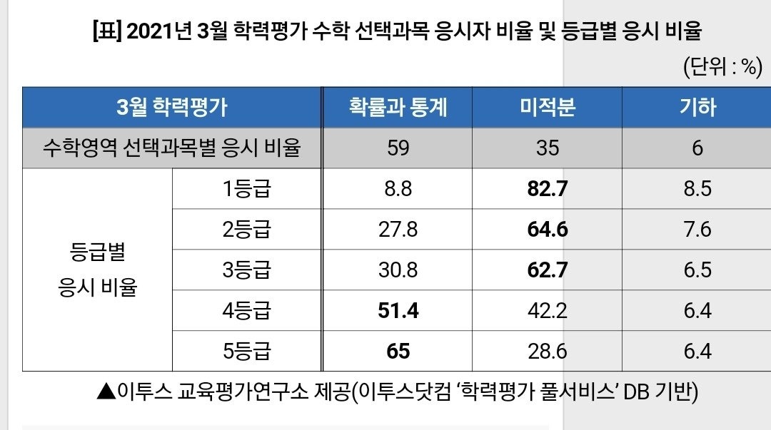 이런 가운데 교육평가연구소는 “이투스닷컴 내 ‘학력평가 풀서비스’에 입력된 수험생의 점수를 분석한 결과, 수학 영역에서 인문계열의 등급 하락이 예고됐다”고 밝혔다. 인문계열 학생들이 주로 선택한 ‘확률과 통계’ 응시자들의 1~3등급 비율이 ‘미적/기하’를 선택한 집단에 비해 상대적으로 열세로 나타났기 때문.