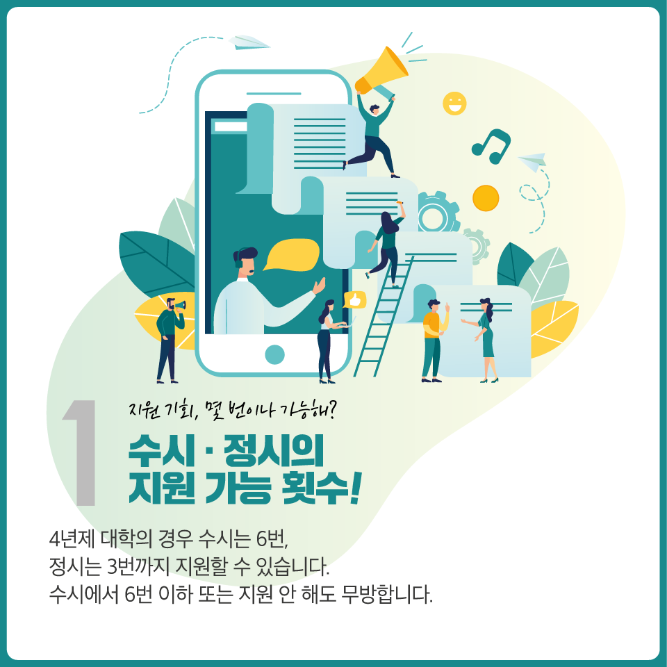 4년제 대학을 기준으로 할 때, 수시전형에서는 6번까지, 정시전형에서는 3번까지 지원 가능합니다.