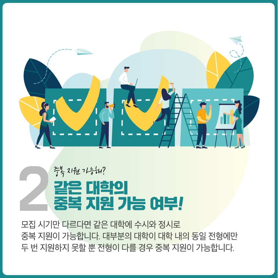 대부분의 대학이 동일 전형에서 중복 지원을 불허할 뿐, 전형이 다를 경우 중복 지원이 가능합니다.