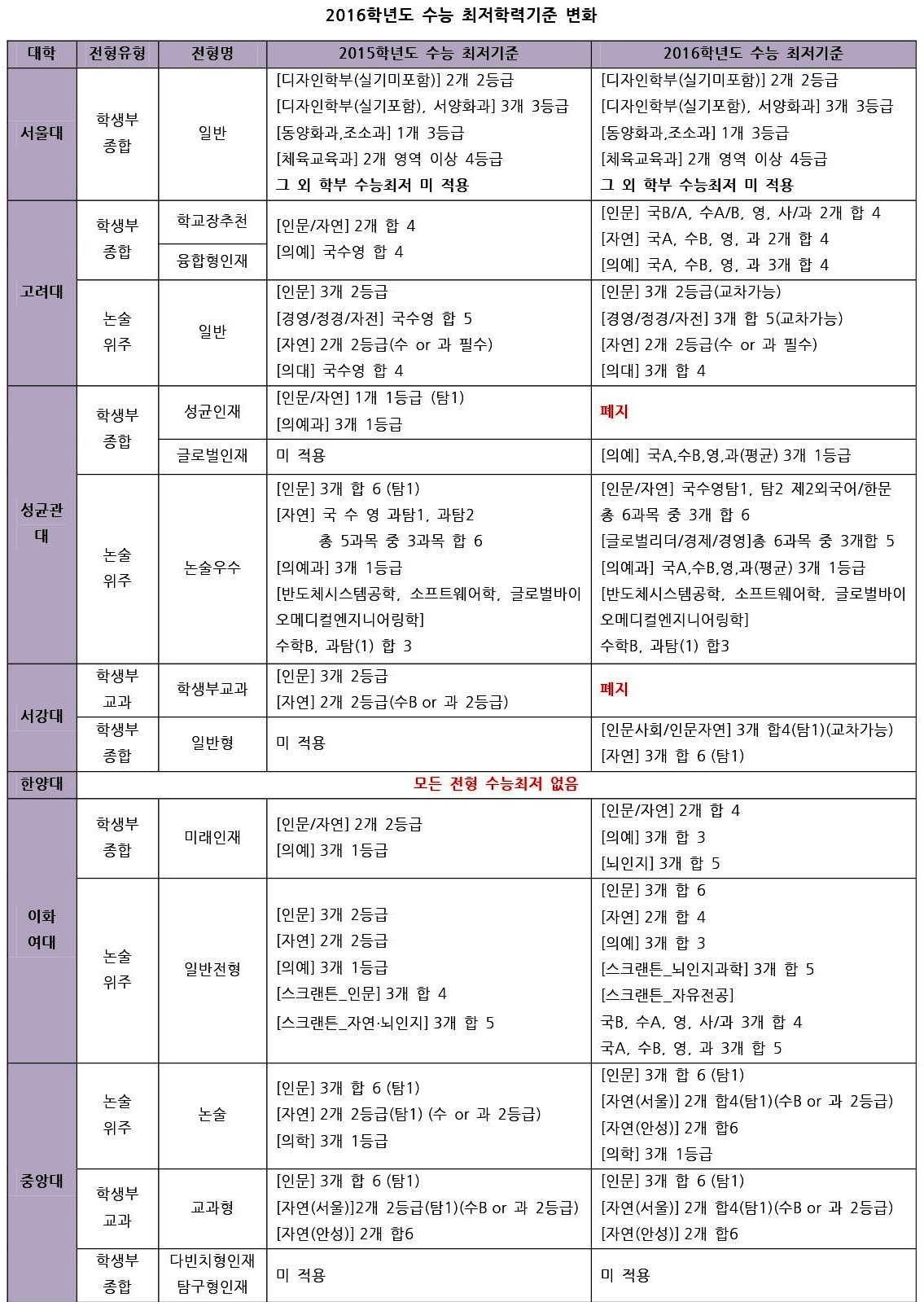 2016학년도 수능 최저학력기준 변화